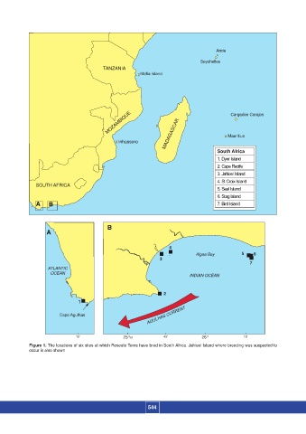 Figure 1. The locations of six sites at which Roseate Terns have bred in South Africa. Jahleel Island where breeding was suspected to