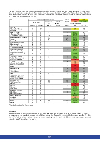 Table 2: Estimates of numbers of Damara Terns (pairs) breeding at different localities in Angola and Namibia between 1982 and 2021/22