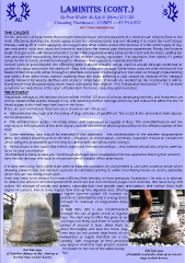 LAMINITIS (CONT.) By Peter Waller B.App.Sc (Hons) D.V.M. Consulting Nutritionist - COMPLEAT FEEDS http://www.compleatfeed.com/ T THE CAUSES THE CAUSES THE CAUSES HE CAUSES It is the presence of these toxins that elevates blood pressure and development of a ‘short-circuit’ of blood flow to the hoof, effectively shunting the blood supply across the coronary band and not allowing it to reach the hoof proper thereby cutting off or short supplying vital oxygen and other amino acids to the laminae. It is this short supply of oxy- gen and amino acids that cause the laminae to react with the intense pain the horse experiences. Finally, the laminae begin to degenerate with blood and other serum collecting and pooling between the hoof and the bone, adding fur- ther pressure and expounding the tearing of the laminae causing separation. This separation then allows P3 (pedal bone) to sink or rotate; sometimes enough to allow the hoof capsule to separate and fall off. In most cases of grain founder, the offending grain is almost certainly wheat, and it is usually through accidental in- gestion of a large amount (in the vicinity of ~6kg) that causes the damage. Other lesser cases are often the fault of the feeder of the horse who either through an intentional increase of cereal grains in the ration or through implementing bad advice from other horse owners suddenly finds the horse suffering a colic caused by acidosis of the hindgut; quickly followed by watery diarrhea and elevated temperature. If bloods are worked by the veterinarian it will be found the pH will be substantially lower (more acid and in the range of ~4 or 5 instead of the normal 7 – 7.5) all these symptoms are indications of the onset of laminitis in the horse caused by grain overload. T TREATMENTTREATMENT TREATMENTREATMENT Irreparable damage to the laminae is done within the first 12 hours of a horse developing laminitis, and treatment can not be implemented quickly enough to try and avoid any further damage and to try and reduce the effect the loss of blood supply to the hoof may have had on the horse. There are several methods that have been shown to aid – these are: • Administration through oral drenching of large volumes of paraffin oil. This assists in the prevention from absorp- tion of endotoxins. • The administration (under veterinary advice and supervision or supply) of Bute. This anti-inflammatory will not only assist in the reduction of the level of pain, but will also assist in allowing blood flow to the affected aspects of the hoof. • Some veterinary care should be exercised in this treatment – the administration of the sedative acepromazine (Ace). Ace dilates blood vessels in the foot – however, as stated above, veterinary regulation should be considered when using this preparation as there may be undesirable side-effects when using it. • Nerve blocks in the lower foot fetlock region will increase blood flow – this method should also only be adminis- tered by your veterinarian. Immobilize the horse as best you can through locking it up in a stable/box that has supportive flooring that will mini- mize lamella damage and assist in the prevention of rotation of the pedal bone. The best method by far is rather than need to treat this condition, try and prevent it. Use some common sense when allowing obese horses out into lush pastures on unlimited grazing or when hard feeing horses on grains, especially when they are not doing much work. Diets may need to be revised for horses suffering from laminitis or have previously foundered. The idea is to attempt to reduce the amount of carbohydrate both structural and non-structural (sugars and starches). We need to try and reduce the amount of cereals and grasses, especially lush new growth grass and pasture, and replace them with higher oil content. The oil slows digesta flow through the digestive tract, offering a higher nutrient uptake. Oil contains no protein or carbohydrate but is energy dense through its make-up of triglycerides (fatty acids). A high fibre diet is also recommended through the use of grass, cereal or legume hays. The best way to offer the grass or ce- real hays is to firstly soak them in water for a period of around ½ hour, allow them to drain thoroughly and feed the horse. Leg- ume hays do not contain high levels of car- bohydrates or sugars therefore are a rea- sonably ‘safe’ roughage to feed provided you keep in mind the high protein content in relation to the rest of the ration being Tell Tale signs Tell Tale signs of Nutrition changes in diet, show up as fed. of laminitis or founder, show up as concave inverted rings on their hooves. rings on their hooves.