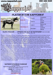 PLATINUM VOM RAPPENHOF Intermezzo Liguster Lilie Carino *E* Kobalt Caterina Karina Burnus AA Habicht Hallo Palma Nigra *E* Insterruf Passarge II Palma BLACK STALLION 16.3h OFFERED FOR SALE OR PARTNERSHIP AUD $59,000 Reg# OSB-A-S356 DOB 2nd of May 1998 P P P Platinum is at the height of his show and breeding career, healthy, sound, fertile, extremely easy and comfortable to ride and handle by everybody with impeccable manners on the show ground. Platinum has received several ATA Horse of the Year Hunter Awards, the Oldenburg Star Award for Performance and the Canadian Warmblood (CWHBA) Lifetime Achievement Award in 2010. He succeeded in all four classic disciplines: Placed 3rd 0f 33 and 7th of 37 Three Day Events BC 2009; 11 Horse of the Year Champion Working Hunter titles 2005 - 2007, winner Blainville International, Blainville Open Classic, Champion Bromont International and at Thunderbird 2010 under US rider Jack Hammond; 2nd ATA Jumper stakes (4'3") OH 2006 and at Topline Summer Derby Jumper Show, Salmon Arm 2009; 2008 Indiv. Gold Medal 1st level dressage Quebec Equestrian Games Bromont, Res. Champion 1st level Beaulieu Dressage Classic 2008 and Kelowna Dressage Festival 2009(national), Freestyle win- ner Salmon Arm Dressage Show 2009; 2nd at Blainville International CDI 2008 and at 2nd level Salmon Arm 2009. P P P Platinum's 'carbon copy' tall, typey, relaxed offpring are Oldenburg High Score and Breed Show Champions incl. at BC Sport- horse Show Cloverdale 2010,national champion high score mares US and Canada, Hunter and Dressage Champions on the A circuit from Vermont to California. Platinum is also approved ATA, Oldenburg/ISR, CSHA, CTHS and CWHBA . Free DVD available. Video footage on Platinum and offspring at YouTube accounts mrsrappenhof & rappenhofsporthorse. P P P Pedigree: Platinum's parents are both ATA Elite, who produced together 4 ATA stallions and one ATA model mare, who also has an ATA Model Mare as daughter. A daughter of his dam by Guy Laroche became also ATA Model Mare with national high score in Canada and USA. His sire Carino led the ATA list in mares bred and was Canadian Sporthorse 'Stallion of the Year'. His dam was honored with the highest ATA Award for a broodmare, the Gerda Friedrichs Award and is also an ATA Honor roll Mare. She is half sister to Olympians Livius (Anne Kursinski) and Windfall (Darren Chiacchia) and from the mare family of Olympians Peron (Michelle Gibson) and Partout (Anky van Grundsven). Dam sire Habicht was for many years member of the German eventing team and arguably the successful Trakehner stallion after WW II. Habicht's sire Burnus was # 1 sire of Germany in number of win- ners. Grand dam, Verband Elite Mare Palma, was German Res.Champion Broodmare. Platinum's paternal great grand sire Inter- mezzo, halfbrother to Olympic medalists Adular and Afrika, was German Champion Stallion. Through Liguster (State Stud Stallion Zweibruecken, Rhineland Palatinate, Platinum is related to World, Olympic and Worldcup Champion jumper Abdullah. 'RAPPENHOF SPORTHORSE OKANAGAN' Connie Kempter, 6260 Sidley Mountain Rd. / corner Hwy 3 'Crowsnest Hwy' Bridesville, BC, CANADA V0H 1B0 PHONE 0011-1-250-446-2149 FAX 250-446 2148 connie@rappenhof.com www.rappenhof.com