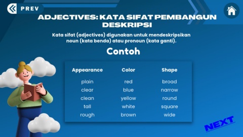 Kata sifat (adjectives) digunakan untuk mendeskripsikan noun (kata benda) atau pronoun (kata ganti). Contoh Appearance Color Shape plain red broad clear blue narrow clean yellow round tall white square rough brown wide