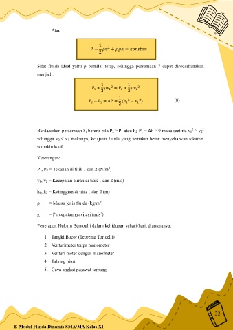 Berdasarkan persamaan 8, berarti bila P2 > P1 atau P2-P1 = ∆P > 0 maka saat itu v1 > v2