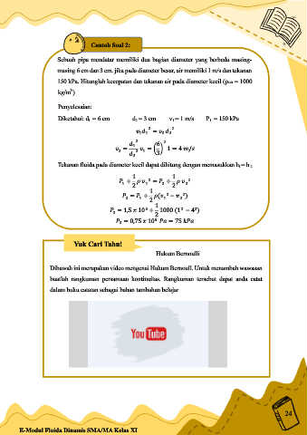 Diketahui: d1 = 6 cm d2 = 3 cm v1 = 1 m/s P1 = 150 kPa