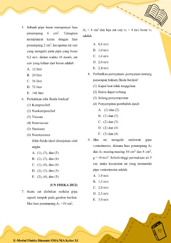 5. Sebuah pipa besar mempunyai luas A2 = 4 cm dan laju zat cair v2 = 4 m/s besar v1