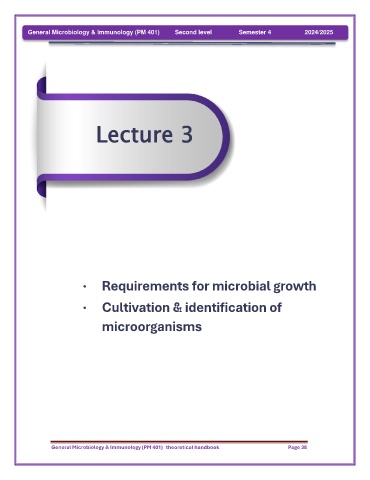 General Microbiology & Immunology (PM 401) Second level Semester 4 2024/2025 Lecture 3 • Requirements for microbial growth • Cultivation & identification of microorganisms General Microbiology & Immunology (PM 401) theoretical handbook Page 38