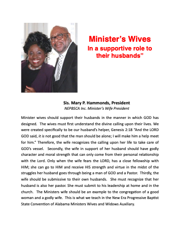 Minister wives should support their husbands in the manner in which GOD has designed. The wives must first understand the divine calling upon their lives. We were created specifically to be our husband’s helper, Genesis 2:18 “And the LORD GOD said, it is not good that the man should be alone; I will make him a help meet for him.” Therefore, the wife recognizes the calling upon her life to take care of GOD’s vessel. Secondly, the wife in support of her husband should have godly character and moral strength that can only come from their personal rela?onship with the Lord. Only when the wife fears the LORD, has a close fellowship with HIM; she can go to HIM and receive HIS strength and virtue in the midst of the struggles her husband goes through being a man of GOD and a Pastor. Thirdly, the wife should be submissive to their own husbands. She must recognize that her husband is also her pastor. She must submit to his leadership at home and in the church. The Ministers wife should be an example to the congrega?on of a good woman and a godly wife. This is what we teach in the New Era Progressive Bap?st State Conven?on of Alabama Ministers Wives and Widows Auxiliary.