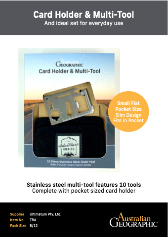 Card Holder & Multi-Tool And ideal set for everyday use Stainless steel multi-tool features 10 tools Complete with pocket sized card holder Small Flat Pocket Size Slim Design Fits in Pocket Supplier Item No. Pack Size Ultimatum Pty. Ltd. TBA 6/12