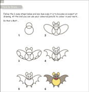 10 Follow the 6 easy steps below and see how easy it is to become an expert at drawing. At the end you can use your coloured pencils to colour in your work... Is that a Bat?... 12 34 56