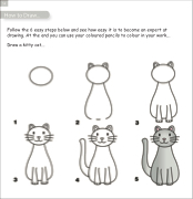 14 Follow the 6 easy steps below and see how easy it is to become an expert at drawing. At the end you can use your coloured pencils to colour in your work... Draw a kitty cat...