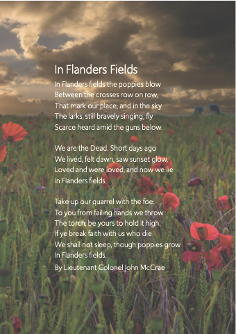 In Flanders fields the poppies blow Between the crosses row on row, That mark our place; and in the sky The larks, still bravely singing, fly Scarce heard amid the guns below.