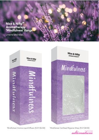 Nice & NiftyTM Aromatherapy ‘Mindfulness’ Range Unwind and relax... ‘Mindfulness’ Aroma Liquid Diffuser (R.R.P. $12.99) ‘Mindfulness’ Gel Bead Migraine Wrap (R.R.P. $9.99)