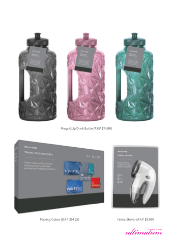 Mega Gulp Drink Bottle (R.R.P. $14.99) Packing Cubes (R.R.P. $14.99) Fabric Shaver (R.R.P. $9.99)