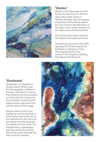 Warden is the Nyoongar word for Ocean, this artwork is an abstract view of the Indian Ocean in Western Australia. from the greens and yellows of the shallow waters and rock pools to the dark blues of the deep ocean, to the turquoise of the waters around Rottnest Island.
