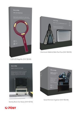 COB LED Magnifier (R.R.P. $9.99) Aluminium Wallet & Multi-Tool Duo (R.R.P. $14.99) Identity Block Out Stamp (R.R.P. $7.99) Swivel Remote Organiser (R.R.P. $12.99)