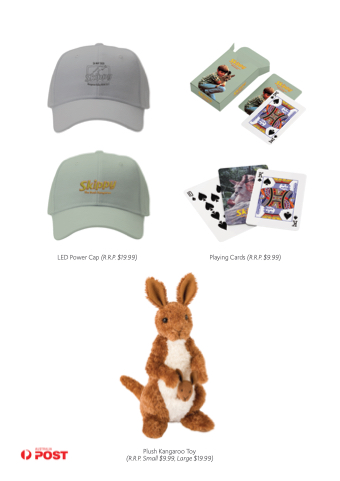 LED Power Cap (R.R.P. $19.99) Playing Cards (R.R.P. $9.99) Plush Kangaroo Toy (R.R.P. Small $9.99, Large $19.99)