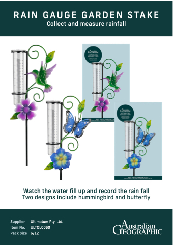 RAIN GAUGE GARDEN STAKE Collect and measure rainfall Watch the water fill up and record the rain fall Two designs include hummingbird and butterfly Supplier Item No. Pack Size Ultimatum Pty. Ltd. ULTOL0060 6/12