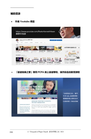 輔助資源 • 作者 Youtube 頻道 https://www.youtube.com/PastorKennethKwan 關得年牧師 • 「基督福樂之家」聯同 PCPA 線上基督學院,提供綜合的教育課程 「 基督福樂之家 」 聯同 PCPA 線上基督教學院 將會提供線上教學,結合 《在家教育》的綜合課程 186 © Vineyard of Hope Church 基督福樂之家 2021