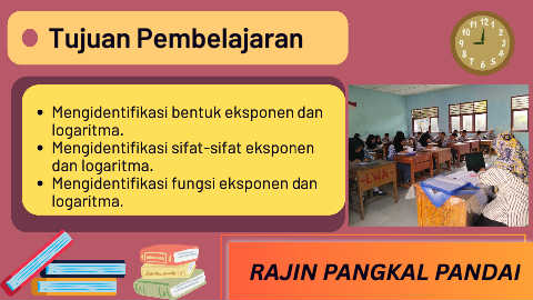 Tujuan Pembelajaran Mengidentifikasi bentuk eksponen dan logaritma. Mengidentifikasi sifat-sifat eksponen dan logaritma. Mengidentifikasi fungsi eksponen dan logaritma. RAJIN PANGKAL PANDAI