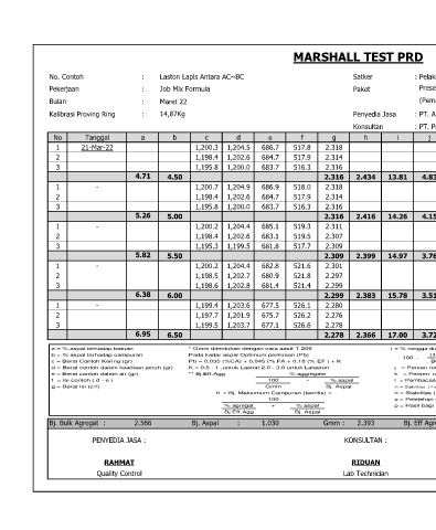 g = Berat Isi (c/f) Gmm Bj. Aspal m = Stabilitas ( l x kalibrasi proving ring ),( kg ) q = Kadar Aspal Efektif