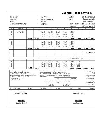 % agregat + % aspal p = Hasil bagi marshall ( kg/mm )