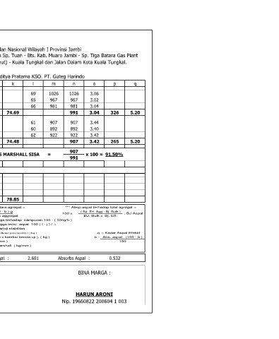 Bj. Bulk Agregat : 2.566 Bj. Aspal : 1.030 Gmm 2.393 Bj. Eff Agregat : 2.601 Absorbs Aspal : 0.532