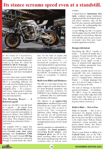 not a café racer for Sunday posing or The SB-11 is the kind of bike that doesn't belong on the bike.