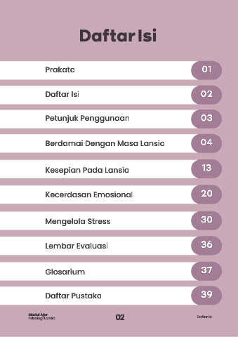 Daftar Isi Prakata Daftar Isi Petunjuk Penggunaan Berdamai Dengan Masa Lansia Kesepian Pada Lansia Kecerdasan Emosional Mengelola Stress Lembar Evaluasi Glosarium Daftar Pustaka Modul Ajar 02 Daftar Isi Psikologi Lansia