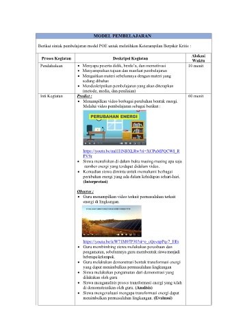 Berikut sintak pembelajaran model POE untuk melatihkan Keterampilan Berpikir Kritis :