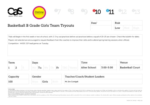 Trials will begin in the first week or two of school, with 2-3 try out practices before out practices before a squad of 20-25 are chosen. Check the bulletin for dates.