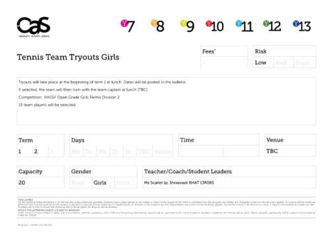 Tryouts will take place at the beginning of term 1 at lunch. Dates will be posted in the bulletin.
