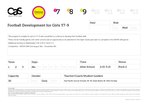 This program is suitable for girls in Y7-9 who would like to continue to develop their football skills.