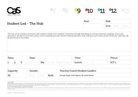 The Hub will be a student community with a desire to better enrich students’ school lives through technology by hosting workshops, meetings, forums and
