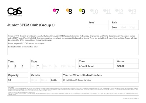 Aimed at Y7-9 this club provides an opportunity to get involved in STEM projects (Science, Technology, Engineering and Maths) Depending on the project carried
