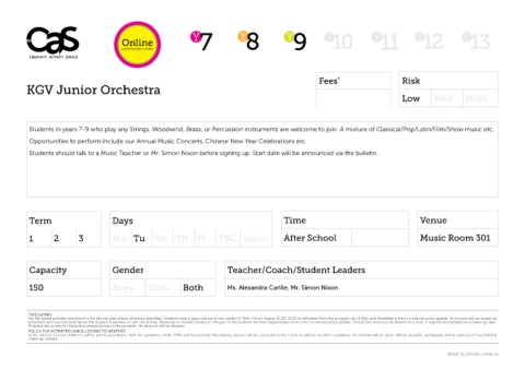 Students should talk to a Music Teacher or Mr. Simon Nixon before signing up. Start date will be announced via the bulletin.