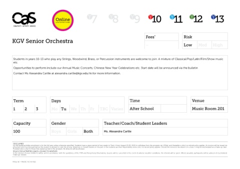 Contact Ms Alexandra Carlile at alexandra.carlile@kgv.edu.hk for more information.