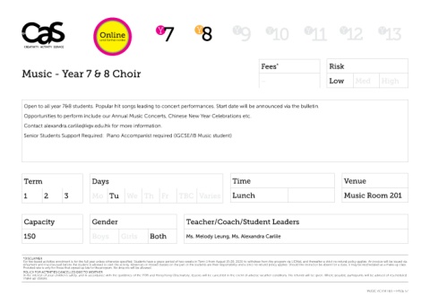 Open to all year 7&8 students. Popular hit songs leading to concert performances. Start date will be announced via the bulletin.