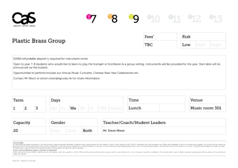 Open to year 7-8 students who would like to learn to play the trumpet or trombone in a group setting. Instruments will be provided for the year. Start date will be