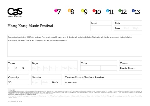 Support with entering HK Music festivals. This is not a weekly event and all details will be in the bulletin. Start date will also be announced via the bulletin