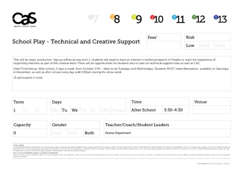 Date/Time/Venue: After school, 2 days a week, from October 27th - likely to be Tuesdays and Wednesdays. Students MUST make themselves available on Saturdays
