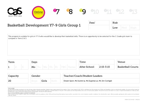 This program is suitable for girls in Y7-9 who would like to develop their basketball skills. There is an opportunity to be selected for the C Grade girls team to
