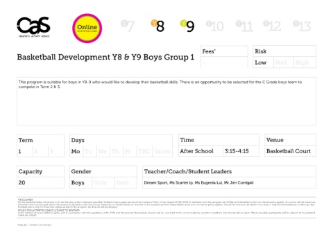 This program is suitable for boys in Y8-9 who would like to develop their basketball skills. There is an opportunity to be selected for the C Grade boys team to