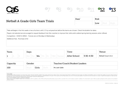 Trials will begin in the first week or two of school, with 2-3 try out practices before the teams are chosen. Check the bulletin for dates.