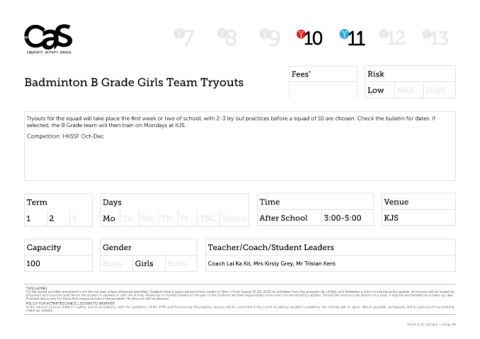 Tryouts for the squad will take place the first week or two of school, with 2-3 try out practices before a squad of 10 are chosen. Check the bulletin for dates. If