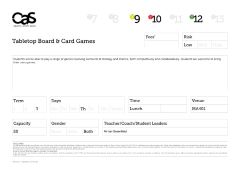 Students will be able to play a range of games involving elements of strategy and chance, both competitively and collaboratively. Students are welcome to bring