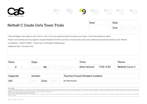 Trials will begin in last week or two in term 1, with 2-3 try out practices before the teams are chosen. Check the bulletin for dates.