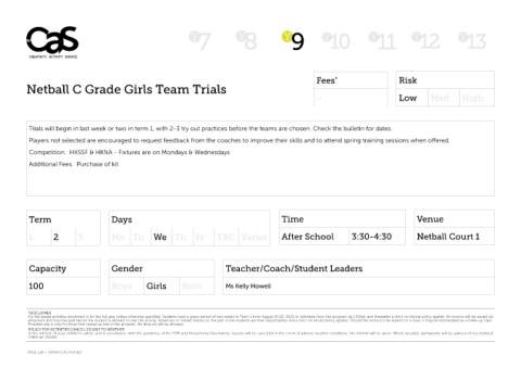 Trials will begin in last week or two in term 1, with 2-3 try out practices before the teams are chosen. Check the bulletin for dates.