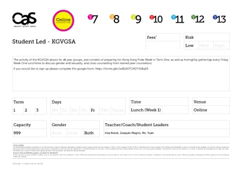 The activity of the KGVGSA allows for all year groups, and consists of preparing for Hong Kong Pride Week in Term One, as well as fortnightly gatherings every Friday