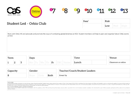 Work with Orbis HK and advocate and promote the issue of combating global blindness at KGV. Student members will help to plan and organize future Orbis events