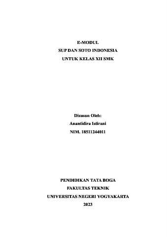 E-MODUL SUP DAN SOTO INDONESIA UNTUK KELAS XII SMK Disusun Oleh: Anantidira Istirani NIM. 18511244011 PENDIDIKAN TATA BOGA FAKULTAS TEKNIK UNIVERSITAS NEGERI YOGYAKARTA 2023