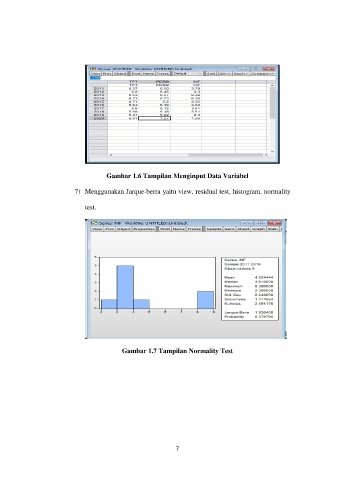 Gambar 1.6 Tampilan Menginput Data Variabel 7) Menggunakan Jarque-berra yaitu view, residual test, histogram, normality test. Gambar 1.7 Tampilan Normality Test 7